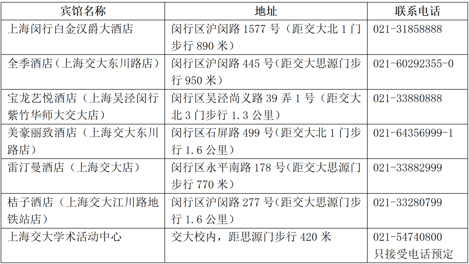 为方便与会学者自行预定会议期间住宿,以下为91论坛 闵行校区周边部分宾馆信息,仅供参考。以下宾馆单人间与标间参考价均在300-450元/间/晚左右,具体价格根据订房时间有所浮动。详询宾馆或商旅平台。