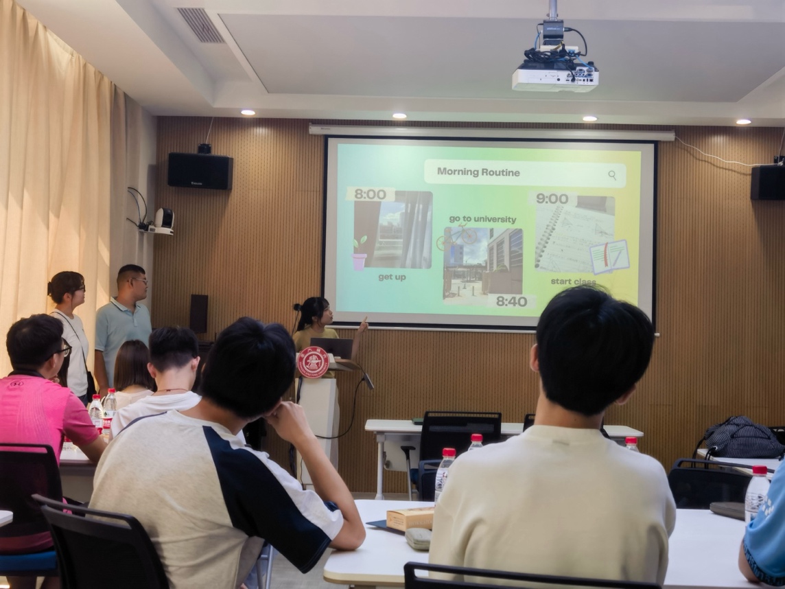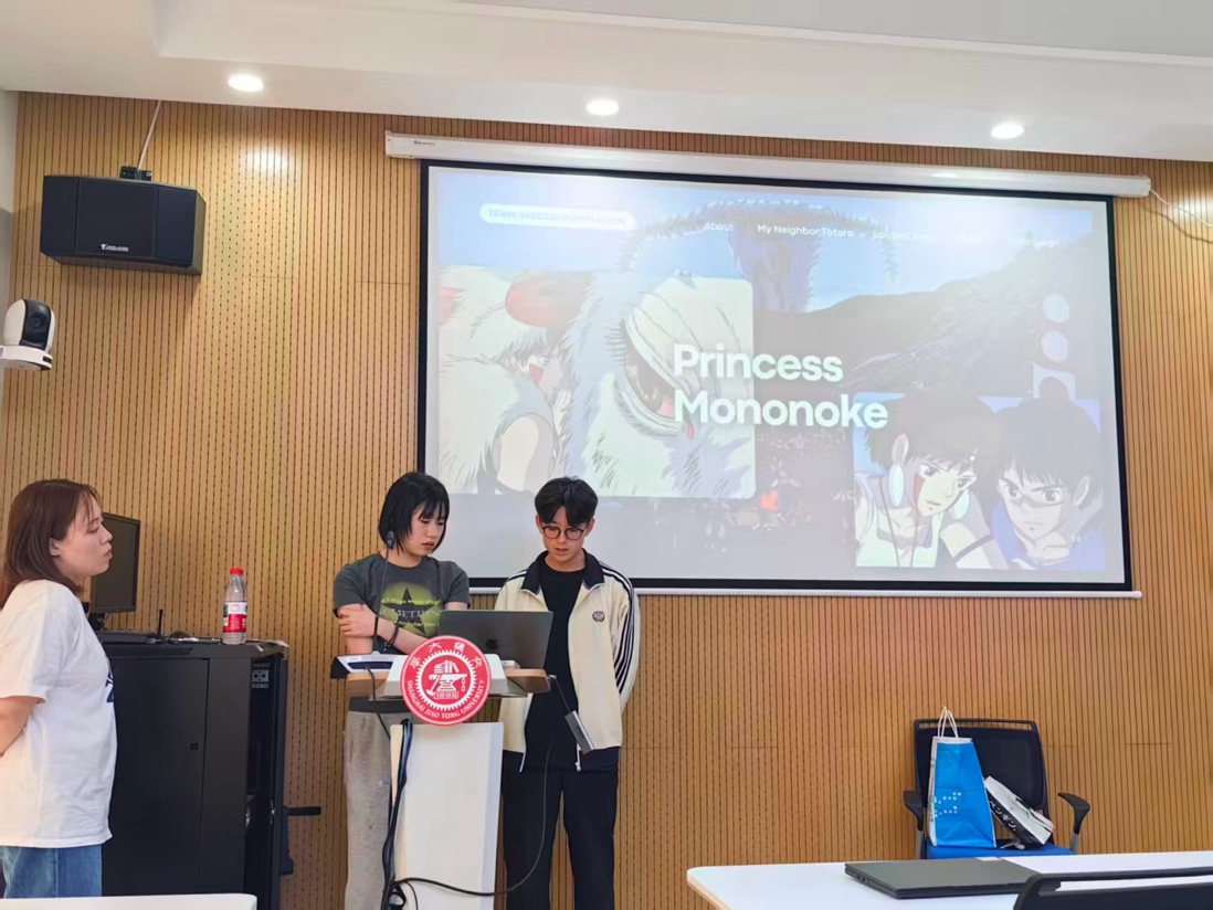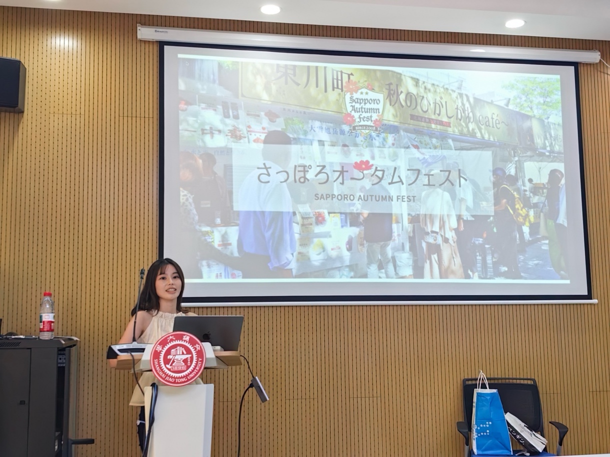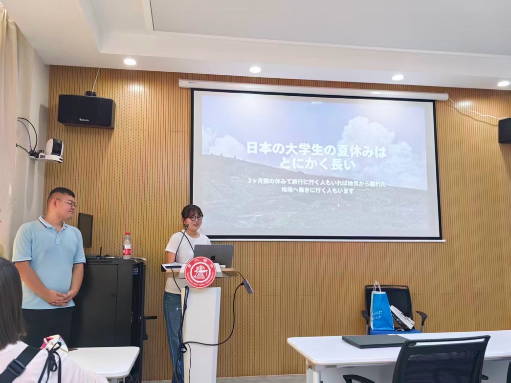 在主题展示环节,北海学園大学学生分组进行了生动的分享。第一组以图文并茂的形式介绍了日本大学生暑期的丰富活动,以及高中生与大学生日常作息的差异;第二组围绕宫崎骏的三部经典动画展开讲解,展现了日本动漫文化的独特魅力;第三组则以家乡札幌为切入点,带领大家感受四季不同的自然风貌与特色活动,还设计了互动问答,整个展示环节内容详实,气氛热烈。