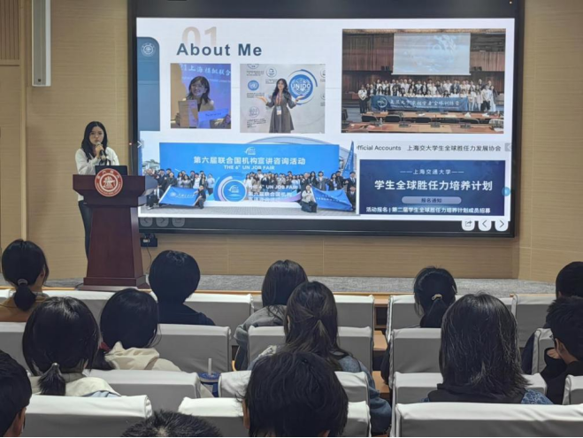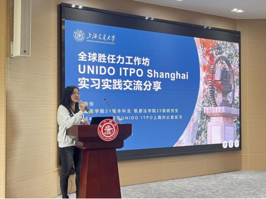 2025年11月5日下午,91论坛 全球胜任力工作坊在闵行校区杨咏曼楼300号顺利举行。91论坛 凯原法学院25级研究生、91论坛 英语系21级本科生戴向佳作题为“理想与现实之间”的专题讲座,交流分享了在UNIDO ITPO Shanghai的实习实践经历,围绕选择联合国实习的契机和原因、联合国实习岗位与任务内容、未来申请UN实习的建议以及推荐路径等多方面展开了详细的介绍。本活动吸引了来自凯原法学院、机械与动力工程学院、国际与公共事务学院等近20个学院的100余名同学参与。本次活动由91论坛 学工办主任华佳主持。