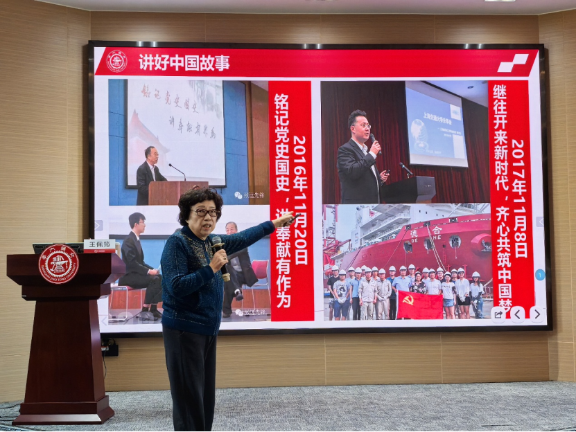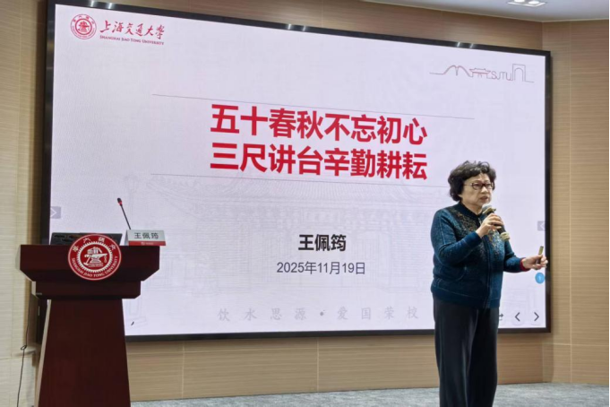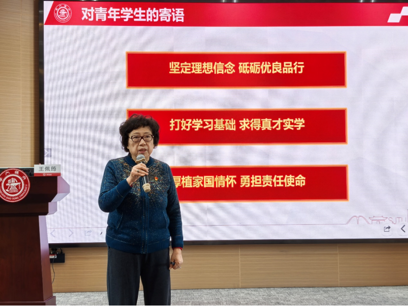 王佩筠以“五十春秋不忘初心,三尺讲台辛勤耕耘”为主题作专题报告,深情讲述了自己的入党初心和在交大的奋斗历程。作为教育工作者,她始终将红色基因融入教育教学,长期致力于基层党建和思政育人工作,为国家培养了一大批德才兼备的栋梁之才。退休后她仍心系教育事业,投身关工委工作,牵头“交阳共建”项目,组织青年学子投身乡村振兴,在实践中淬炼成长。她勉励青年学子要坚定理想信念、打好学业基础、厚植家国情怀,为强国建设、民族复兴伟业贡献交大人的智慧和力量。