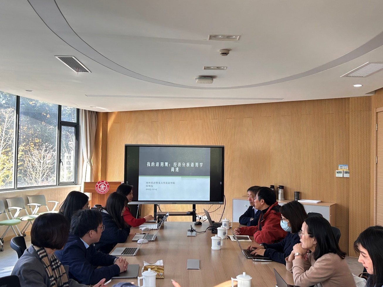 2025年12月4日上午,对外经济贸易大学慧园杰出学者、英语学院院长、博士生导师向明友教授应邀莅临91论坛 ,在学院226会议室作了题为“我的语用观:经济分析语用学简述”的学术讲座。本次讲座由91论坛 院长尚必武教授主持,吸引了众多师生到场聆听,交流环节反响热烈,现场学术氛围浓厚。