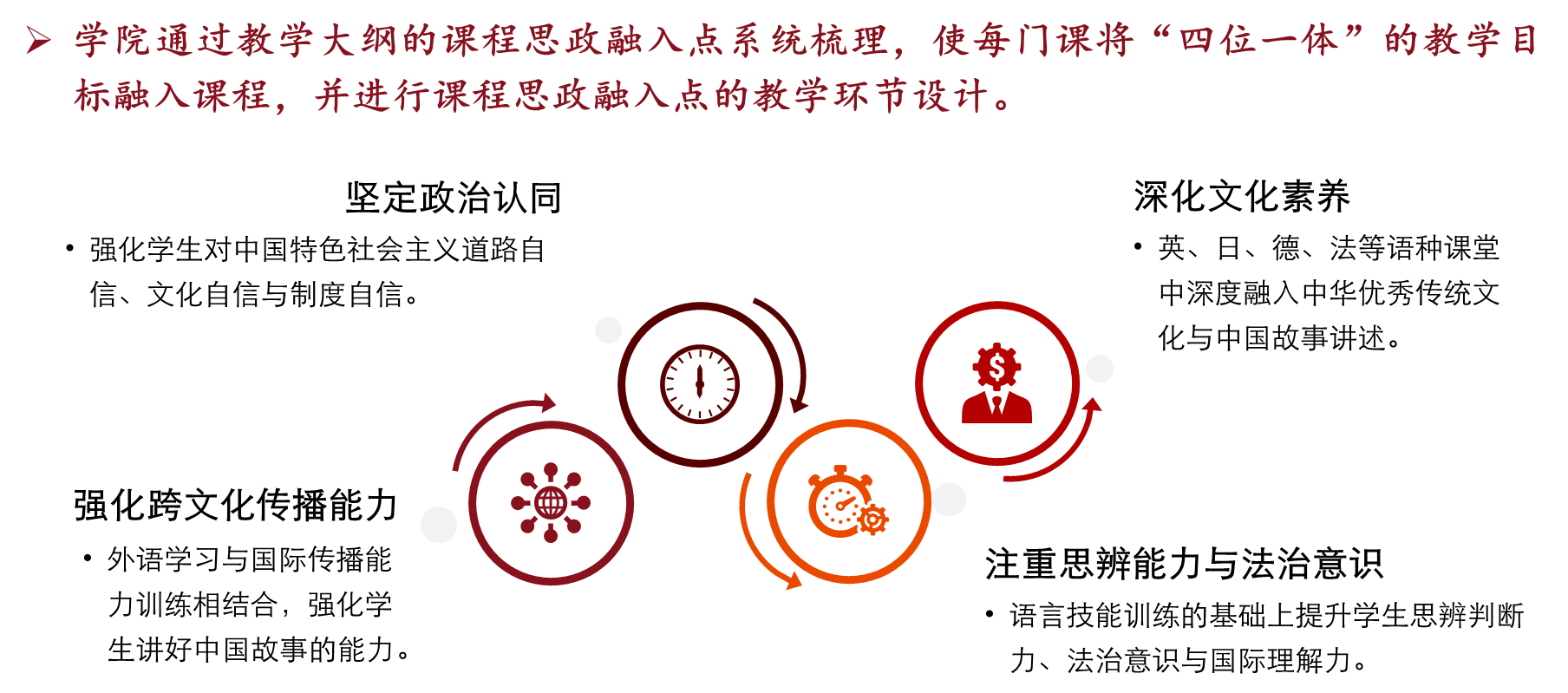 91论坛 始终高度重视课程思政建设,于2020年11月率先成立“外语课程思政中心”,并先后出台《91论坛 课程思政建设工作方案》《91论坛 本科课程思政示范学院建设工作方案》。学院依托外语学科特色,深入挖掘各类课程中的思政元素,有效打破“语言教学”与“价值引领”之间的壁垒,构建起契合外语专业特点的课程思政体系。